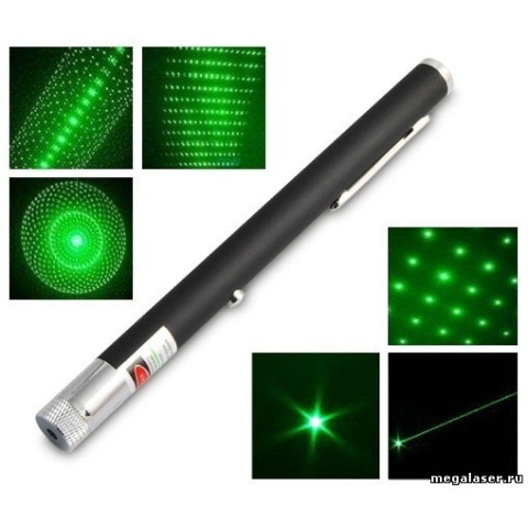 Комплектация: Зеленая лазерная указка в виде ручки, две батарейки типа ААA, 5 (пять) насадок с разными калейдоскопическими эффектами.